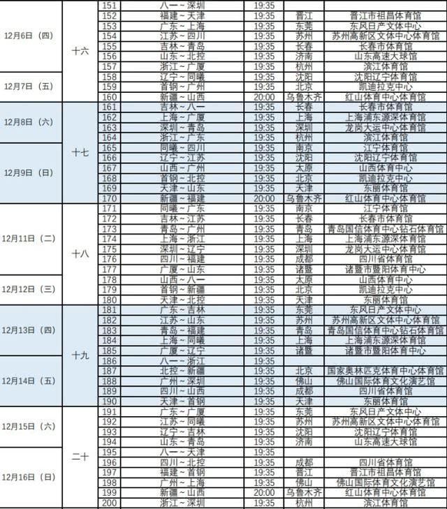 | 5 | 12月13日(周六) | 19:35 | 19:35 | 广东宏远 vs 四川金强 | C组 vs C组 | 广东3胜0负 | 广东新援崔永熙、焦泊乔待磨合 | ★ |
